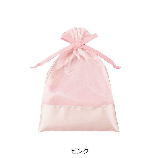 サテンの上品な光沢と、オーガンジーの透け感を組み合わせた華やかな印象の巾着です。角度の変化できらめくオーロラカラーがポイント。中身がほんのり見えるデザインなので、ギフトアイテムをさりげなくアピールでき、特別感のあるラッピングに仕上がります。