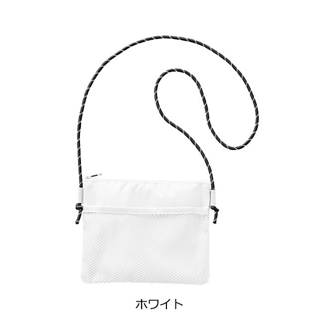 メッシュ素材のポケットが付いたサコッシュです。外ポケットはチケットを入れるのにちょうど良いサイズです。紐部分は結び位置を変えることで長さ調節可能。開口部はファスナーが付いているので貴重品を入れても安心です。アウトドア、イベント、フェスなどにおすすめ。
