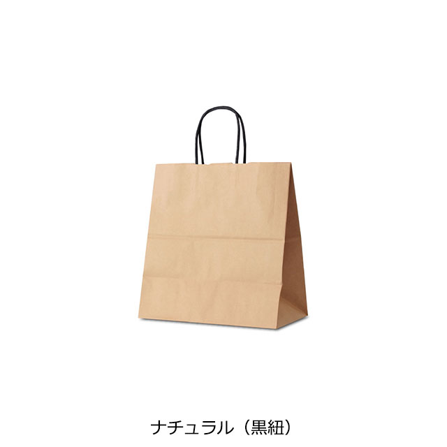汎用性の高いスクエアタイプの手提げ袋です。ナチュラルな風合いながら持ち手の黒紐がアクセントになっています。箔押し名入れが出来るため、ショップや飲食店などのオリジナル紙袋として、しっかりとした見た目の紙袋が小ロットから製作可能。食品やケーキなどのテイクアウト用やアパレル雑貨などのショッパー用としておすすめの商品です。